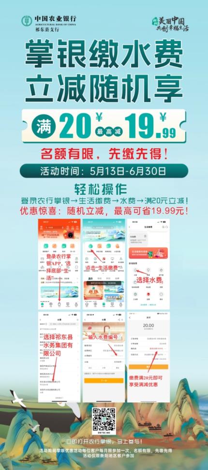 尊敬的用户: 为提供更便捷的缴费服务,我司正式开通农行掌银缴费渠道!即日起,通过农行掌银缴纳水费,不仅能享受指尖操作的便利,还可参与“满20元随机立减”优惠活动,轻松省下一笔小确幸! 活动详情活动时间:即日起至6月30日 参与方式:登录农业银行APP→进入“生活缴费”→选择“水费”→输入户号缴费,满20元即可随机立减! 优惠规则:单笔缴费满20元,立减金额随机,最高可减19.99元!活动期间农行掌银优惠活动每位客户每月限参加一次,名额有限,先缴先得。
